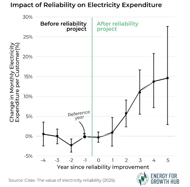 Which brings us back to the question reliability. Research from Senegal shows that power consumers are willing to pay a premium for reliability. Which makes sense. Not having to worry about generators or other backup systems affords power consumers (whether they are households or firms) much-needed peace of mind. More importantly, increasing reliability boosts consumption despite the price increase.
