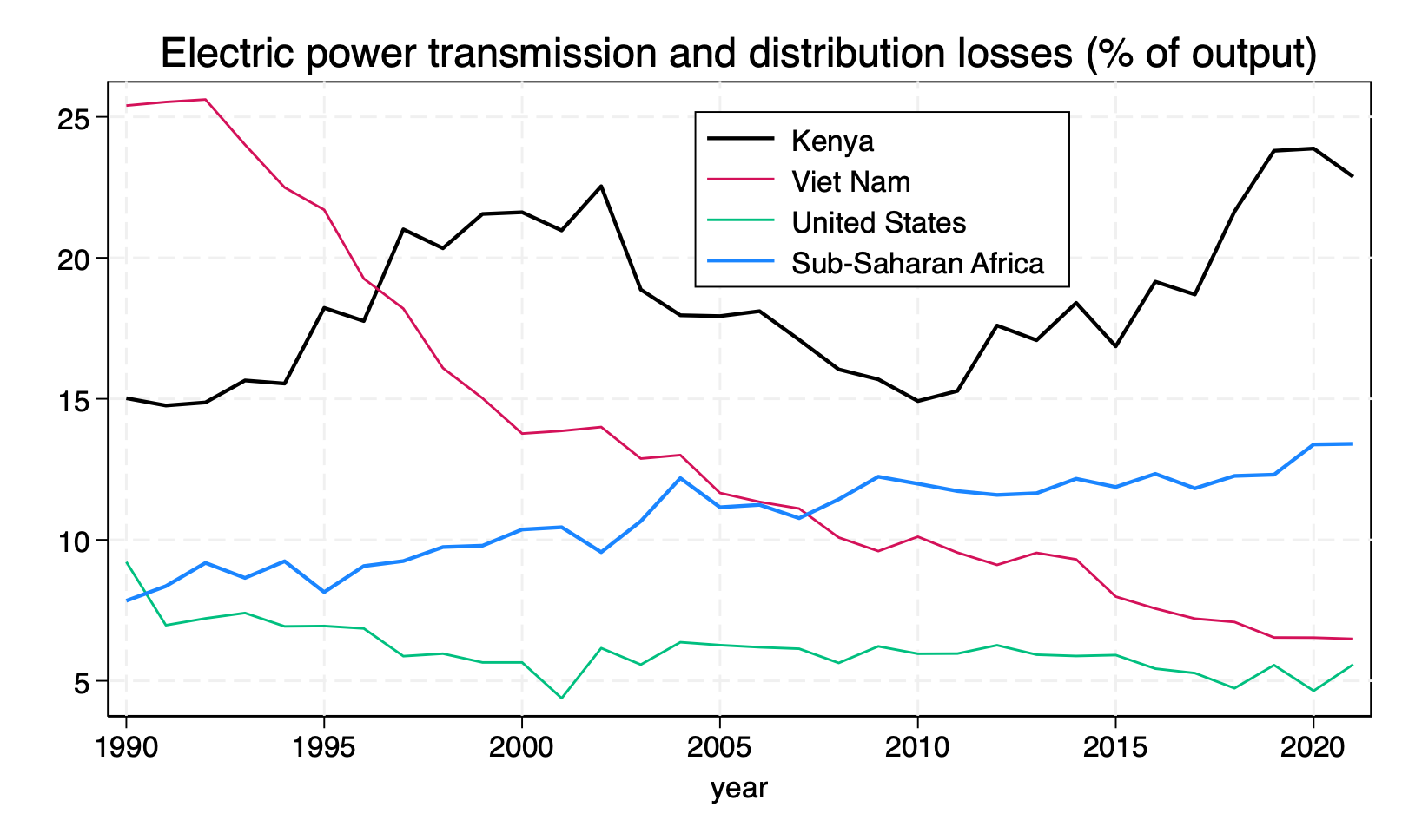 In this regard Kenya is a warning about the problems that lie ahead for Africa’s power sectors. Without sufficient investments in grid resiliency, increasing power generation (and importation) will come with increasing grid collapses as well as transmission and distribution losses. At the moment large swathes of Kenya (especially the Western half and the Coastal region) routinely experience load shedding. Notice that Vietnam (see figure) managed to increase power generation while reducing losses related to transmission and distribution.