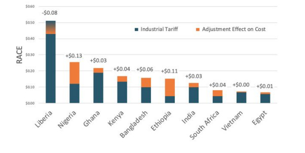 A lot goes into the realized cost of power — from the cost of generation, to grid maintenance, to taxes and levies charged by authorities, to consumers’ purchasing power (subsidized or not), to any back up systems that consumers may need in response to load shedding. The figure below shows a sample of reliability-adjusted costs faced by power consumers. It’s clear from the data that having to invest in back-up systems substantially adds to the cost of power in many African economies.