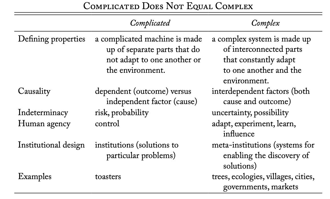 … We face risk in complicated worlds but uncertainty in complex ones. Mechanical situations pose risks—that is, the probability that certain anticipated outcomes may occur (when a toaster breaks down, a user finds it annoying but not surprising). By contrast, complex systems are constantly adapting and thus generate uncertainty—that is, possibilities beyond anticipation and planning. Some possibilities are terrible, such as financial crises and pandemics. Yet some possibilities, such as groundbreaking innovations or stumbling into one’s passion, are marvelous. To extinguish uncertainty is to extinguish possibilities, both terrible and marvelous.