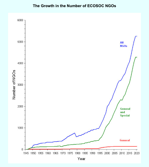 I see two important drivers. First, there was the problem of failed state-led developmentalism in the 1970s and 1980s — which accelerated the NGO-ization of development assistance after the 1990s as a way of coping with state retrenchment (again, Mkandawire was spot on in arguing that this perceived weakness was both ahistorical and overstated). The intensification of NGO-ization was evident, for example, in the explosion of the number of NGOs in consultative status with the UN Economic and Social Council (see graph, the number currently stands at over 6,000). For reference using a specific country example, in 2022 Kenya reported 12,000 registered NGOs, up from just over 400 in 1991.