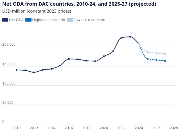 Since then things have moved fast. In 2025 total official development assistance (ODA) was projected to decline by 10%-18%, coming on the heels of a 9% drop in 2024. In addition, many donor countries have also continued the trend of reclassifying domestic spending on immigrants as “foreign aid.”