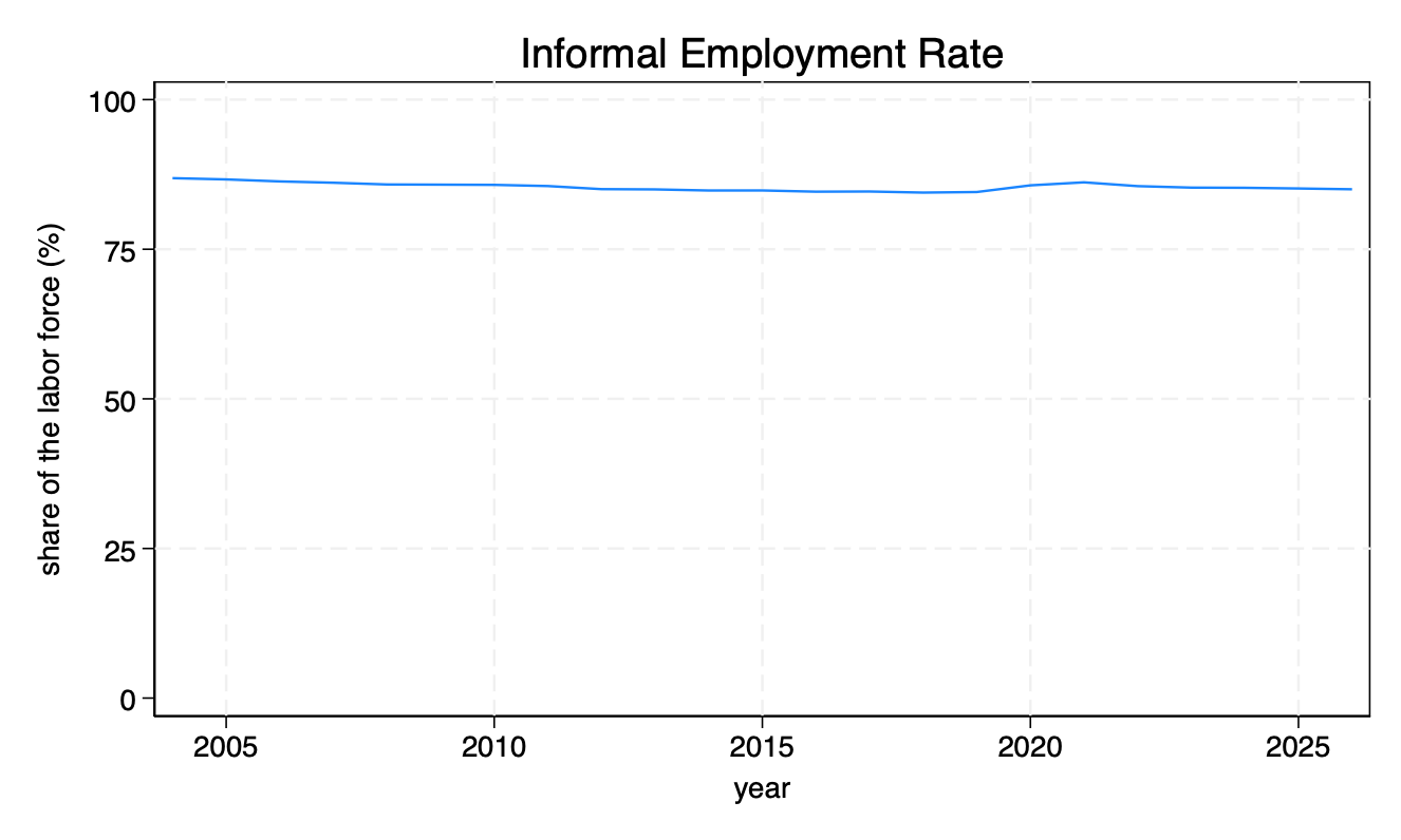 The rate of informal employment in Africa is high, and basically hasn’t budged over the last 20 years. The dearth of formal sector jobs presents an existential crisis for African countries. Over 10m young Africans enter the labor force each year, but the region only creates 3m formal sector jobs. Most workers get absorbed into the informal non-agricultural sector. Fewer every year settle for farming, while many try to migrate outside of the Continent in search of jobs.